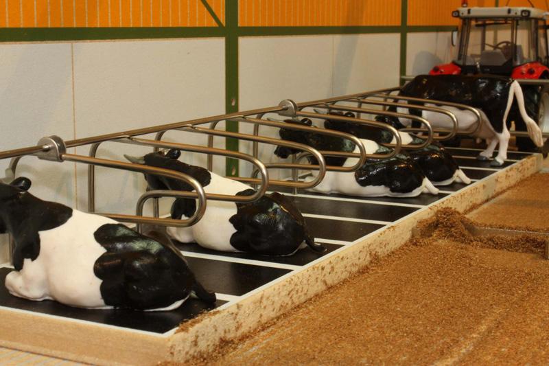 Ligboxen met uitneembare matrassen. De boxen bestaan uit twee ligplaatsen die als modules oneindig aan elkaar te zetten zijn met een klik systeem. Het hekwerk wordt los bij geleverd en is eenvoudig te monteren. De ligboxen zijn van grijze kunsstof, het hekwerk is van zilverkleurige kunststof. Een set bestaat uit 5 maal 2 boxen en is 34 centimeter lang en 7,50 centimeter breed. tip: de pallets van Siku (#7015) zijn prima geschikt om als roostervloer te dienen. 13 pallets hebben precies de lengte van 10 boxen. Ook zijn er kunststof roostvloeren beschikbaar van de fabrikant van de ligboxen.