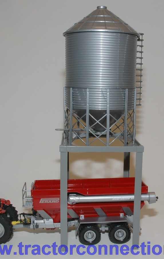 Set van drie silo's. 2 stuks 25 cm hoog en 13,5 cm in doorsnede, een silo 19 cm hoog en 23 cm doorsnede. De set wordt geleverd inclusief een vijzel op wielen die ook achter een trekker kan (trekker niet bijgeleverd).