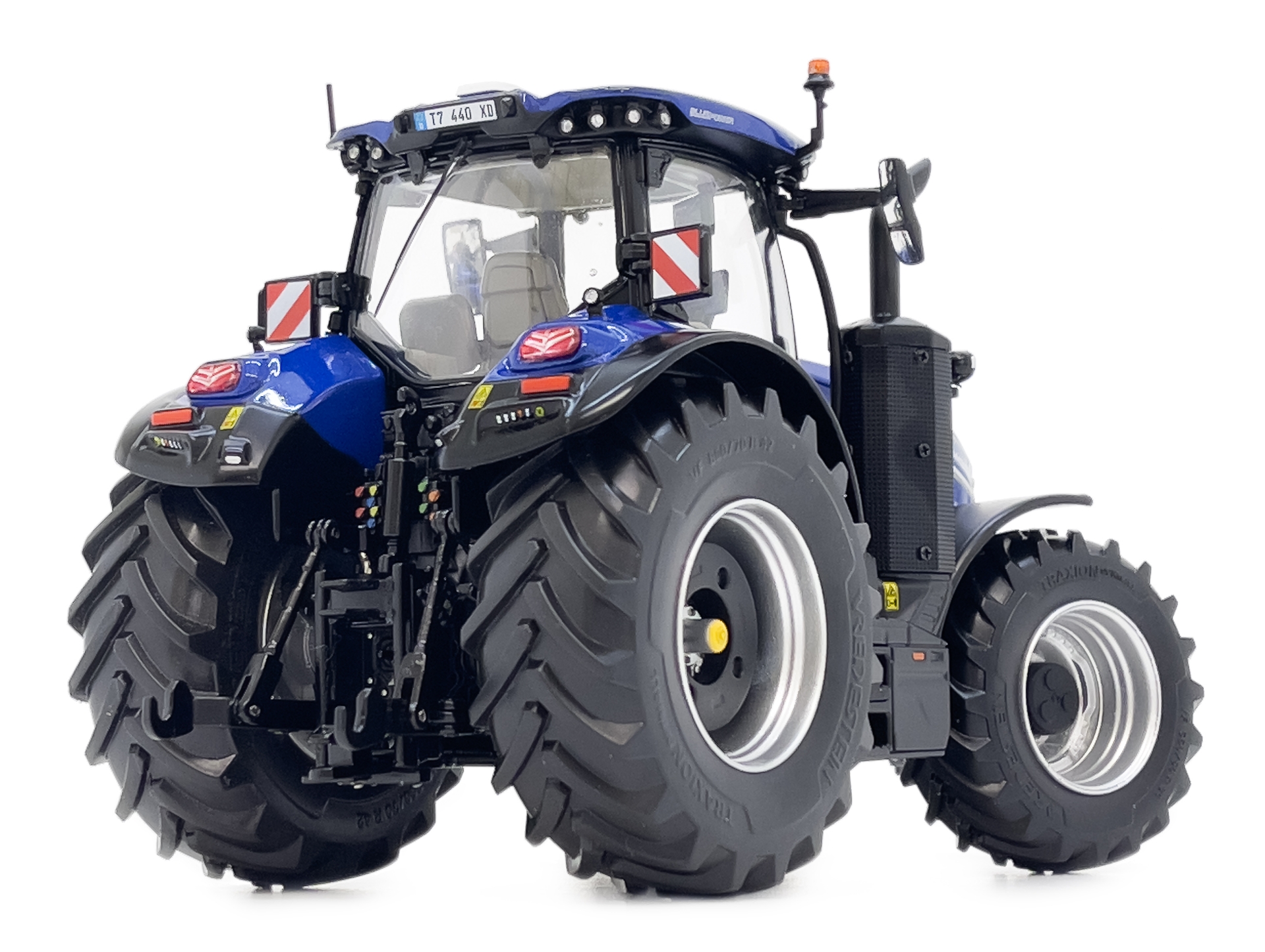 New Holland T7.225 - Blue Power. Zeer gedetailleerde trekker, voorzien van trekhaak en volledige hefinrichting. Heeft ook een beweegbare fronthef en topstang voor en achter. De trekker is vrijwel volledig van metaal. Motorkap en achterspatborden zijn ook metaal en de trekker heeft inklapbare spiegels.