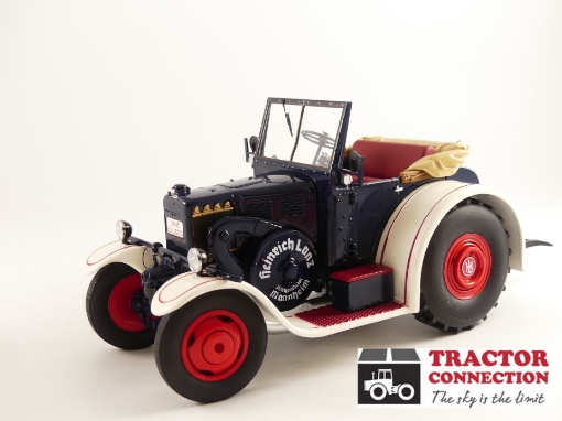 Lanz Eilbulldog met neergeklapte linnen kap. Een precisie trekker die van elk detail is voorzien inclusief lier met ankers achterop. De trekker is vrijwel volledig van metaal gemaakt.