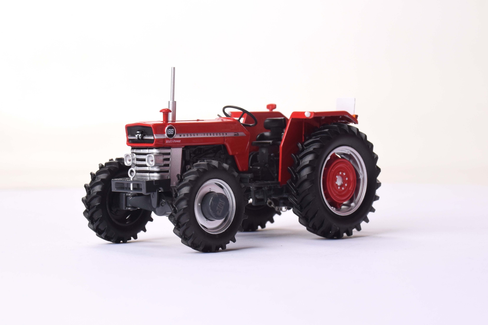 Massey Ferguson 188 4WD miniatuur trekker van Replicagri. Het klepje in de motorkap kan open, de hefinrichting heeft een gatenbalk en een topstang. De vooras is fusee gestuurd.