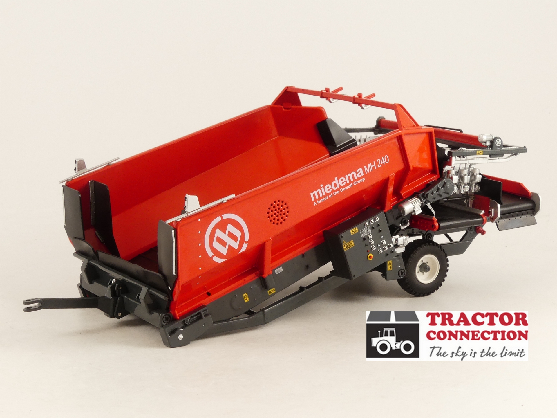 Grimme Ventor 4150 aardappelrooier. Een mooi gedetailleerde machine die overwegend van metaal is gemaakt. De rooibek kan een aantal graden zwenken om in hondengang te rooien. De panelen en de egelabanden kunnen voor transport in- en uitklappen. De machine wordt geleverd met afneembaar wielstel voor weg transport. De rooibek kan heffen en zakken net als de bunkervulband. En allicht kan de bunker in- en uitklappen voor transport.