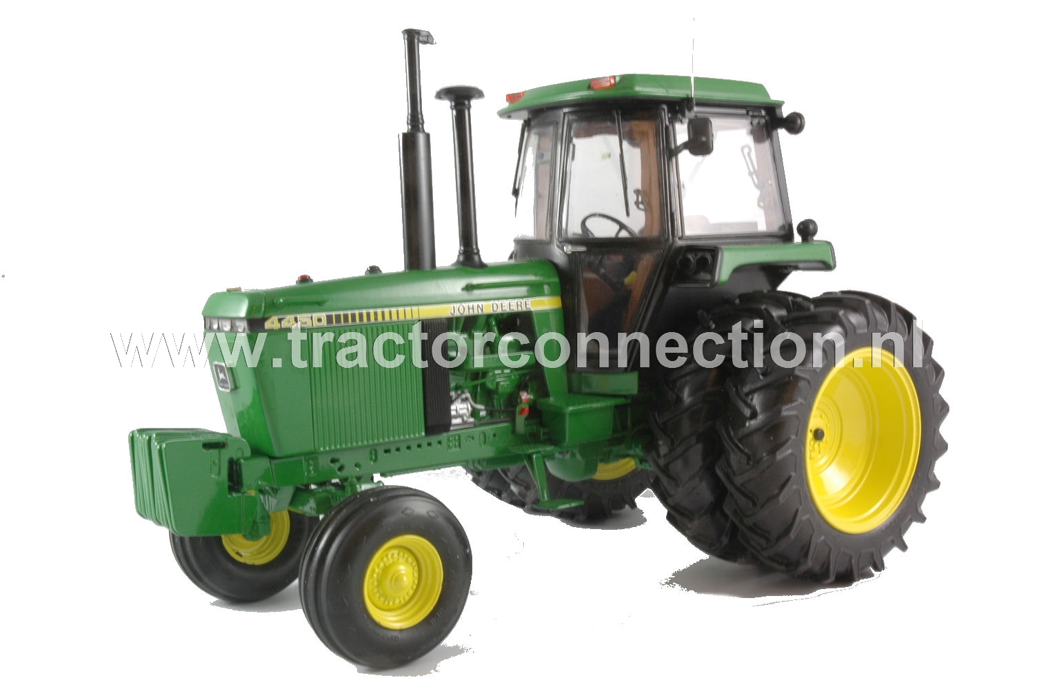 John Deere 4450 Precision Elite serie #1. Een zeer gedetailleerde trekker, voorzien van dubbellucht, metalen wielen, volledig glas in de cabine en volledige hefinrichting met topstang. De cabinedeur en de ramen kunnen open en de zijpanelen zijn wegklapbaar waardoor ook de koeling en de brandstoftank zichtbaar worden. De frontgewichten zijn individueel afneembaar.