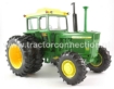 John Deere 4620 FWD op dubbellucht. Een mooi gedetailleerde trekker, vrijwel volledig van metaal. De voorwielen zijn van metaal. de wielschijven van de achterwielen zijn ook metaal, de velgen van het dubbellucht zijn kunststof. Heeft een driepuntshefinrichting met topstang.