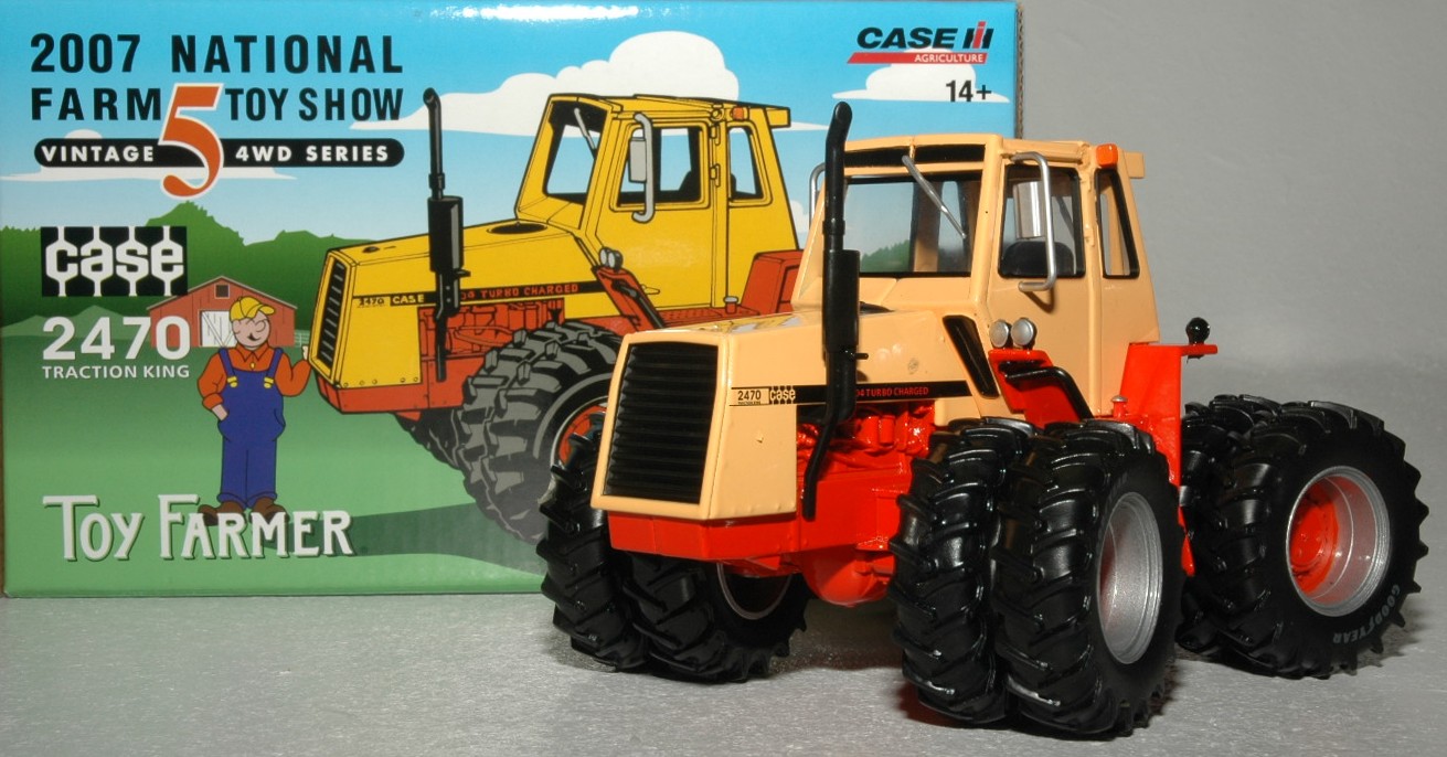 Case 2470 op dubbellucht van Ertl. De trekker is super gedetaileerd. Heeft dubbellucht, metalen velgen en wielplaten en een volledige en super gedetailleerde hefinrichting. Dit is de Toy Farmer National Show tractor voor 2007 en is daarom een eenmalige oplage.