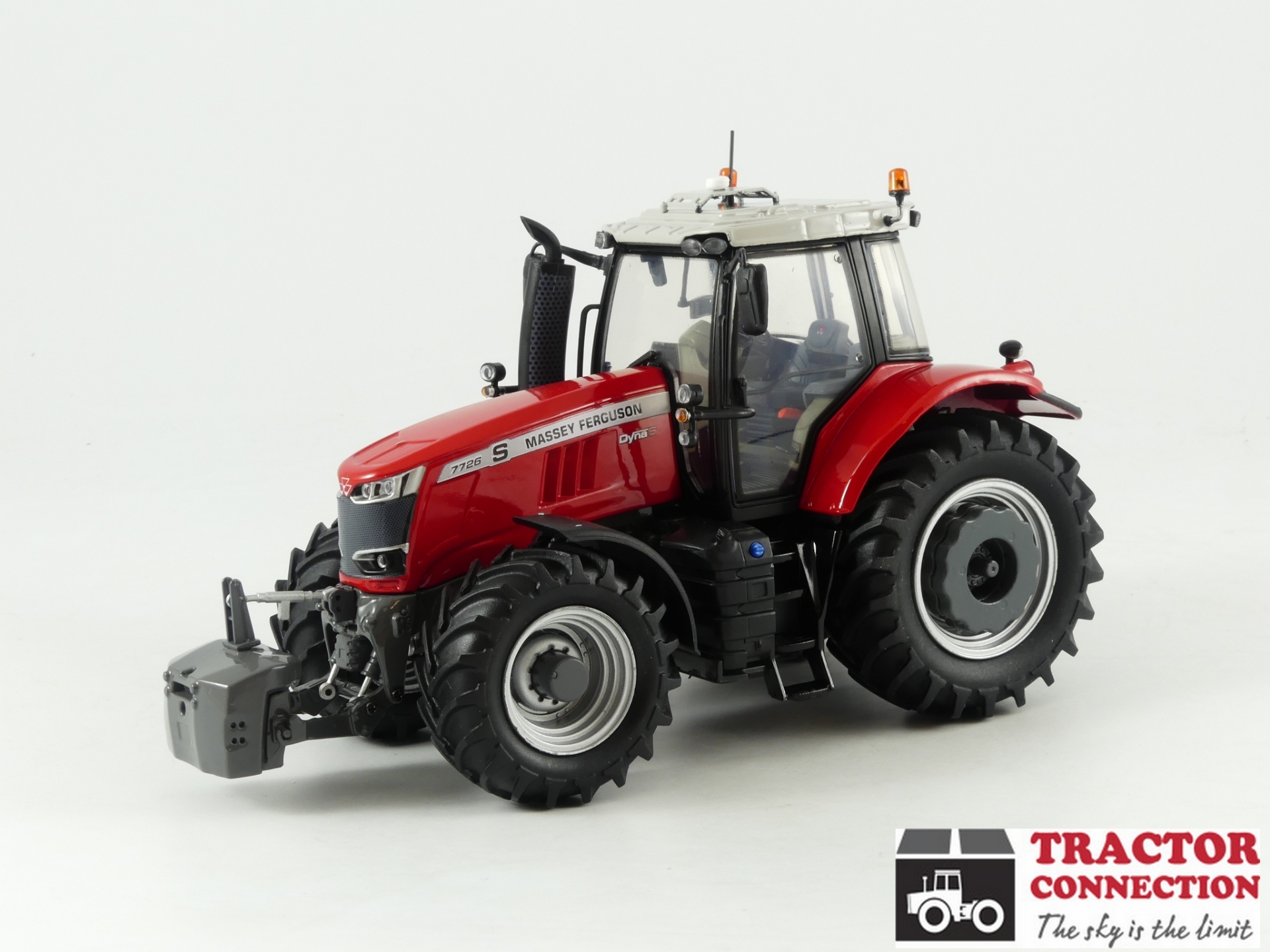 Massey Ferguson 7726S van Universal Hobbies. Zeer gedetailleerde trekker, voorzien van trekhaak en volledige hefinrichting. Heeft ook een beweegbare fronthef en topstang voor en achter en afneembaar frontgewicht.In de fronthef past een Weise-Toys Accord snelkoppeling zodat u ook Siku werktuigen in de front kunt monteren. Accord-bok niet bijgesloten!
