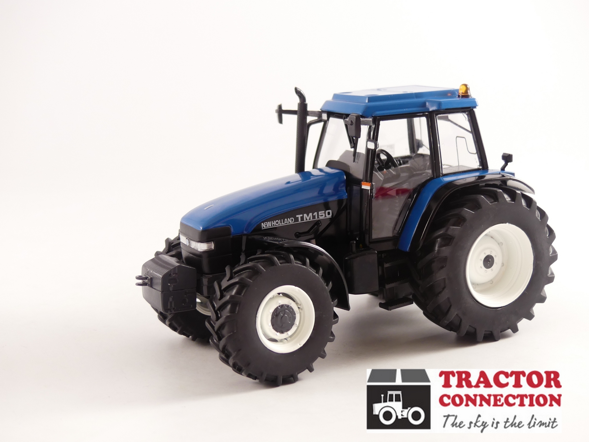 New Holland TM 150 van Replicagri. Deze trekker is goed gedetailleerd en vrijwel volledig van metaal. De trekker wordt geleverd met een uitwisselbare fronthefinrichting, afneembare gatenbalk en in lengte verstelbare topstang.