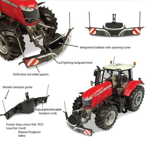 Trekker bumper voor in de fronthef. Netjes voorzien van waarschuwingsborden en instelbare uiteinden. In de kleur Massey Fergsuon grijs.