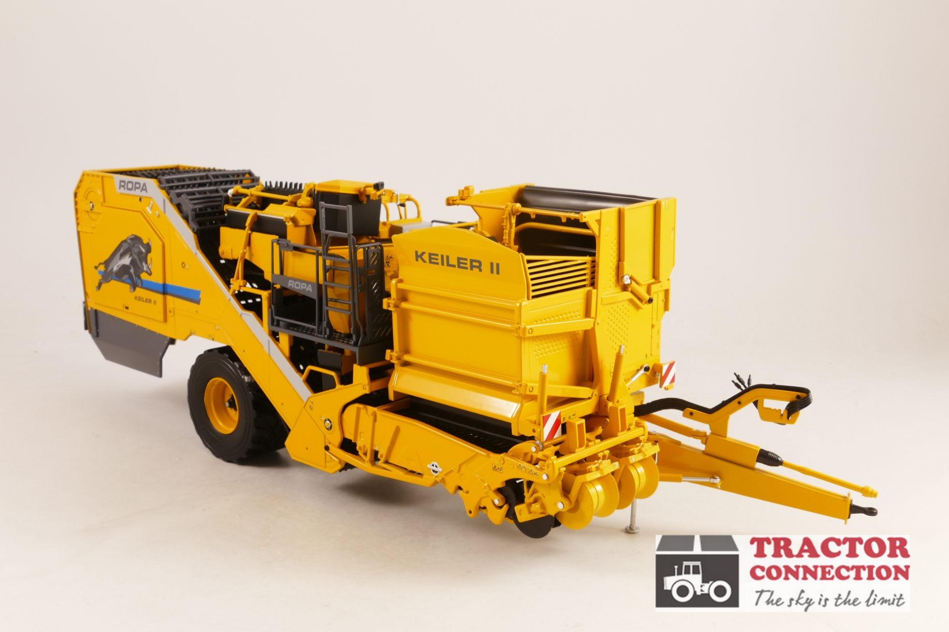 Ropa Keiler II aardappelrooier. Een mooi gedetailleerde machine die overwegend van metaal is gemaakt. De rooibek kan heffen en zakken en de dissel kan bewegen. En allicht kan de bunker in- en uitklappen voor transport.
