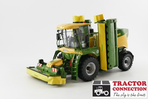 Krone Big M 450 zelfrijdende maaier. Een mooi gedetailleerde machine die overwegend van metaal is gemaakt. De panelen kunnen open net als bij de echte machine. De frontmaaier kan heffen en de zij maaiers kunnen ook in transport als bij de echte machine. De achterwielen zijn bestuurbaar.