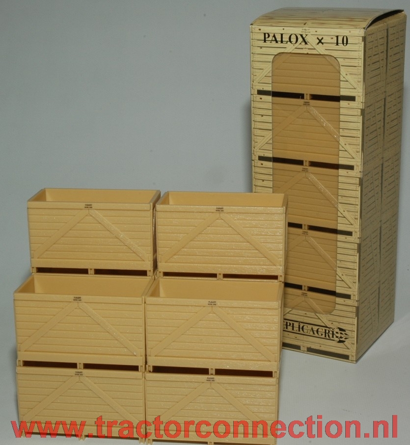 Aardappelkisten/kuubskisten van Replicagri. Kisten zijn van kunsstof, zijn L*B*H = 7,5*3,75*4,5 centimeter.Worden geleverd per 10 en passen precies bij de Maupu platte wagen.