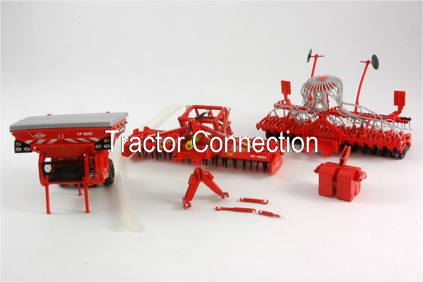 Kuhn TF 1500+HR4004+BTF4000 set van rotorkopeg en pneumatische zaaimachine. Vrijwel volledig van metaal en heel gedetailleerd. De front tank kan naar keuze op een wielstel of een set gewichten worden gemonteerd. De kopeg heeft een hefinrichting om de zaaielementen in transport te tillen. De zaaimachine is uitgerust met markeurs voor spuitsporen. Die kunnen ook omhoog worden gezet. Er worden drie verstelbare topstangen van verschillende lengte mee geleverd om de machine aan verschillende trekkers te kunnen koppelen. Ook wordt een slang meegeleverd en er zitten steunen bij om de zaadtank met het wielstel afgekoppeld weg te kunnen zetten.