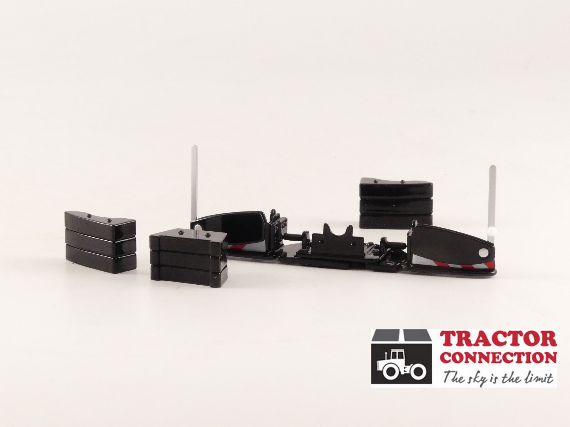 Set frontgewichten voor de Claas Xerion. De set bestaat uit een basisgewicht dat in de driepuntshefinrichting past, zowel voor als achter, en 10 losse gewichten. Die zijn stapelbaar zodat u iedere samenstelling kunt maken die u wenst. Er wordt ook een basisplaat meegeleverd die past achter op de Xerion om daar naar believen gewichtenop te stapelen. Er worden drie hijsogen meegeleverd om de gewichten te kunnen takelen.