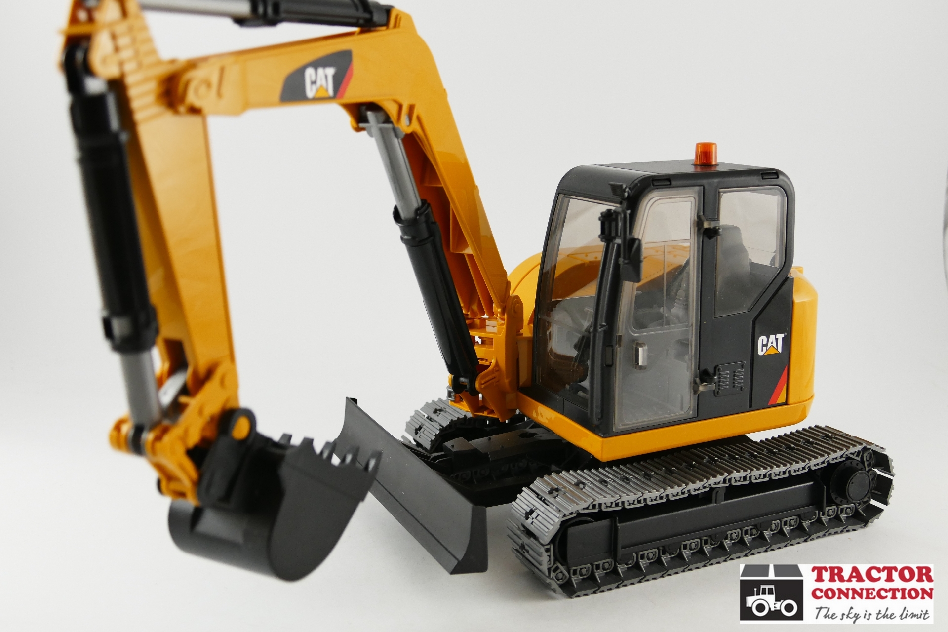 Caterpillar midi kraan op rupsen. De rupsen zijn opgebouwd uit aparte platen net als de echte rupsbanden. De cabine heeft volledig glas en de deur kan open. Ook de motorkap kan open, de kraan arm kan roteren en het dozerblad kan omhoog en omlaag.