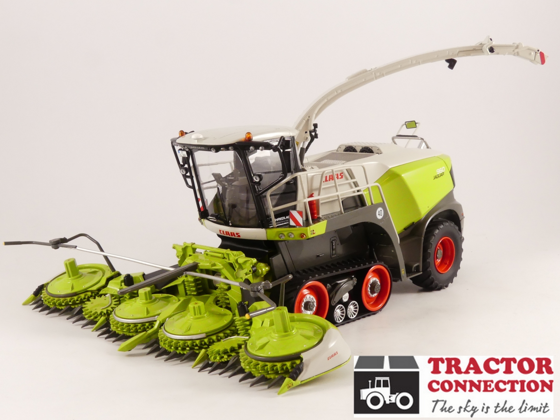 Claas Jaguar 80 SF. Vrijwel volledig van metaal. De maisbek kan heffen en zakken en de blaaspijp kan 180 graden draaien.