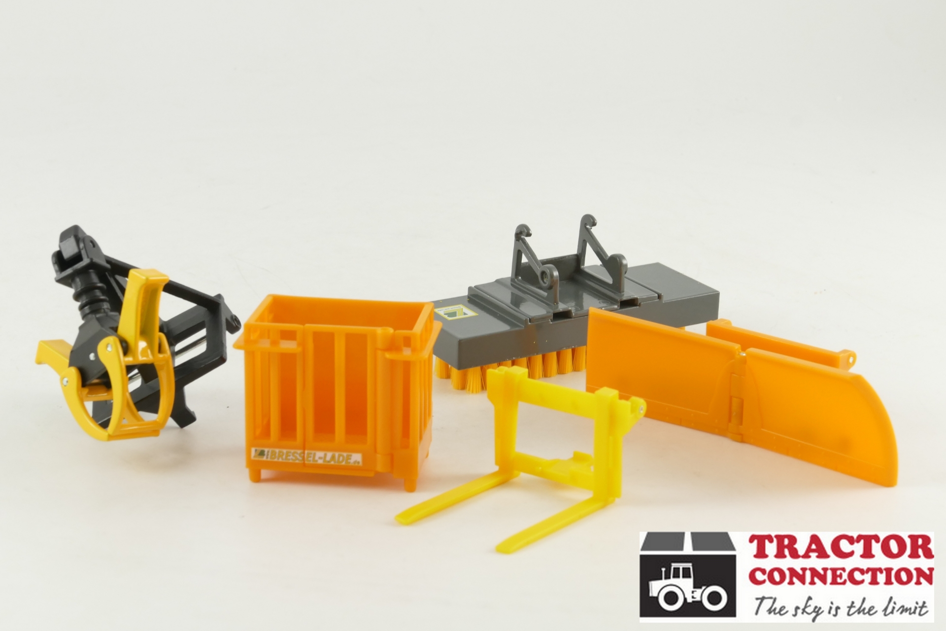 Voorladerset voor Siku trekkers met voorlader waarvan de werktuigen afneembaar zijn. Komt met palletvork, bezem, bomentang, schuif met verstelbare vleugels en werkbox.