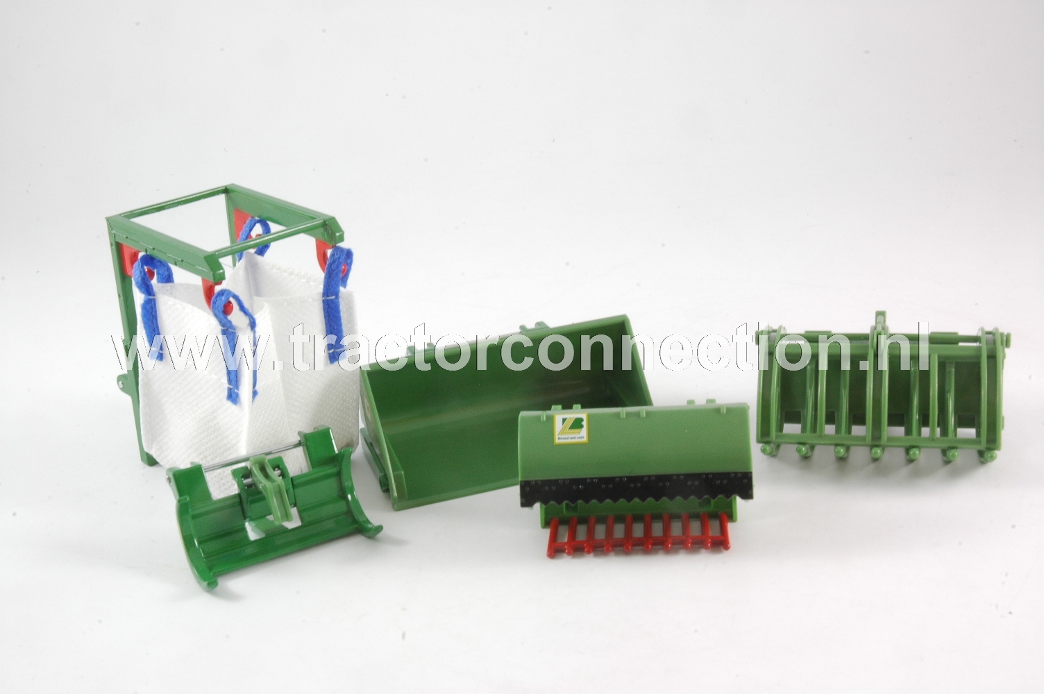 Deze zijn alleen uitwisselbaar met de nieuwe typen voorlader. Van de oudere typen zijn de hulpstukken niet uitwisselbaar. De set bestaat uit een bigbag frame ( een bigbag bijgesloten), schepbak, silagevork, kuilhapper en een bomenklem.