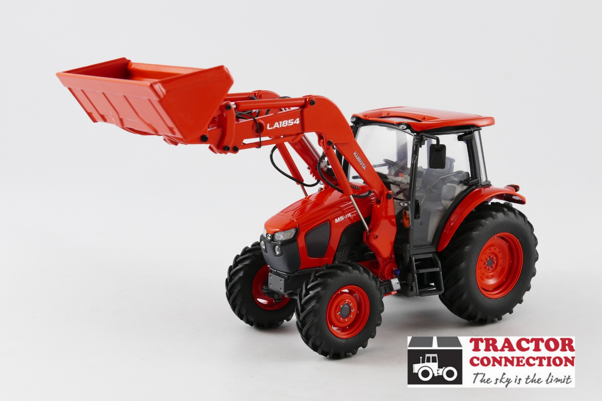 Kubota M5-111 met voorlader. Zeer gedetailleerde trekker, voorzien van trekhaak en volledige hefinrichting. De voorwielen zijn fusee gestuurd en de spiegels kunnen inklappen.